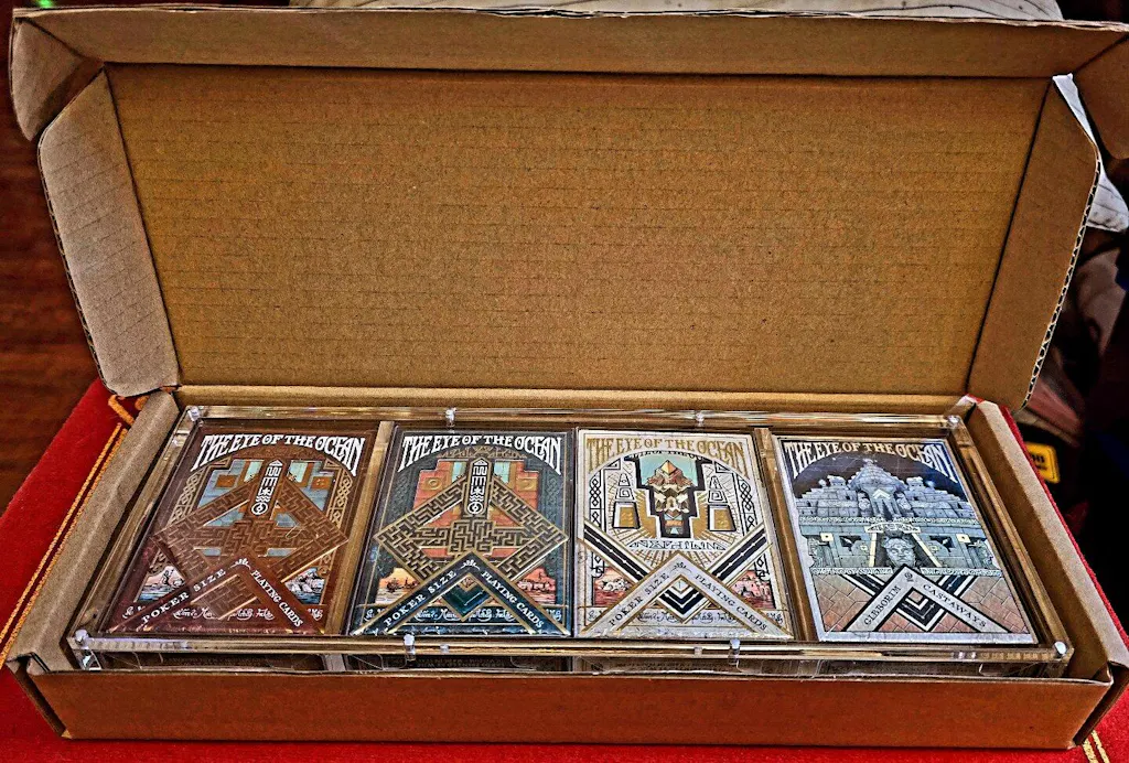 The Eye of the Ocean: Part II is the continuation of the archaeological adventure that began with the original series in 2021. This deck of cards showcases intricate designs inspired by the mysteries of the sea and celestial navigation. Featuring luxurious metallic foils, detailed illustrations, and an elegant fusion of antique maps, marine symbolism, and imaginative storytelling, each card is a work of art. Perfect for collectors and card enthusiasts, The Eye of the Ocean is more than just a deck—it's an immersive adventure wrapped in exquisite craftsmanship.
