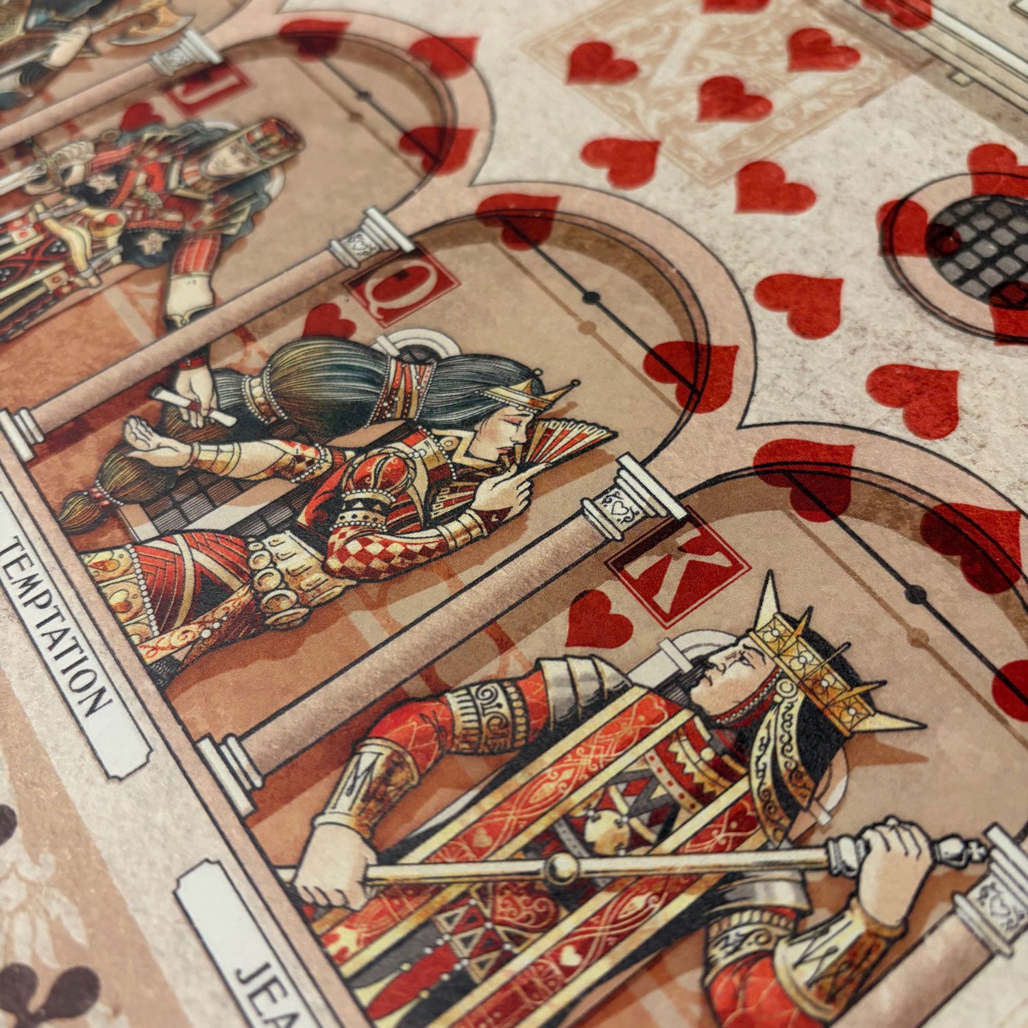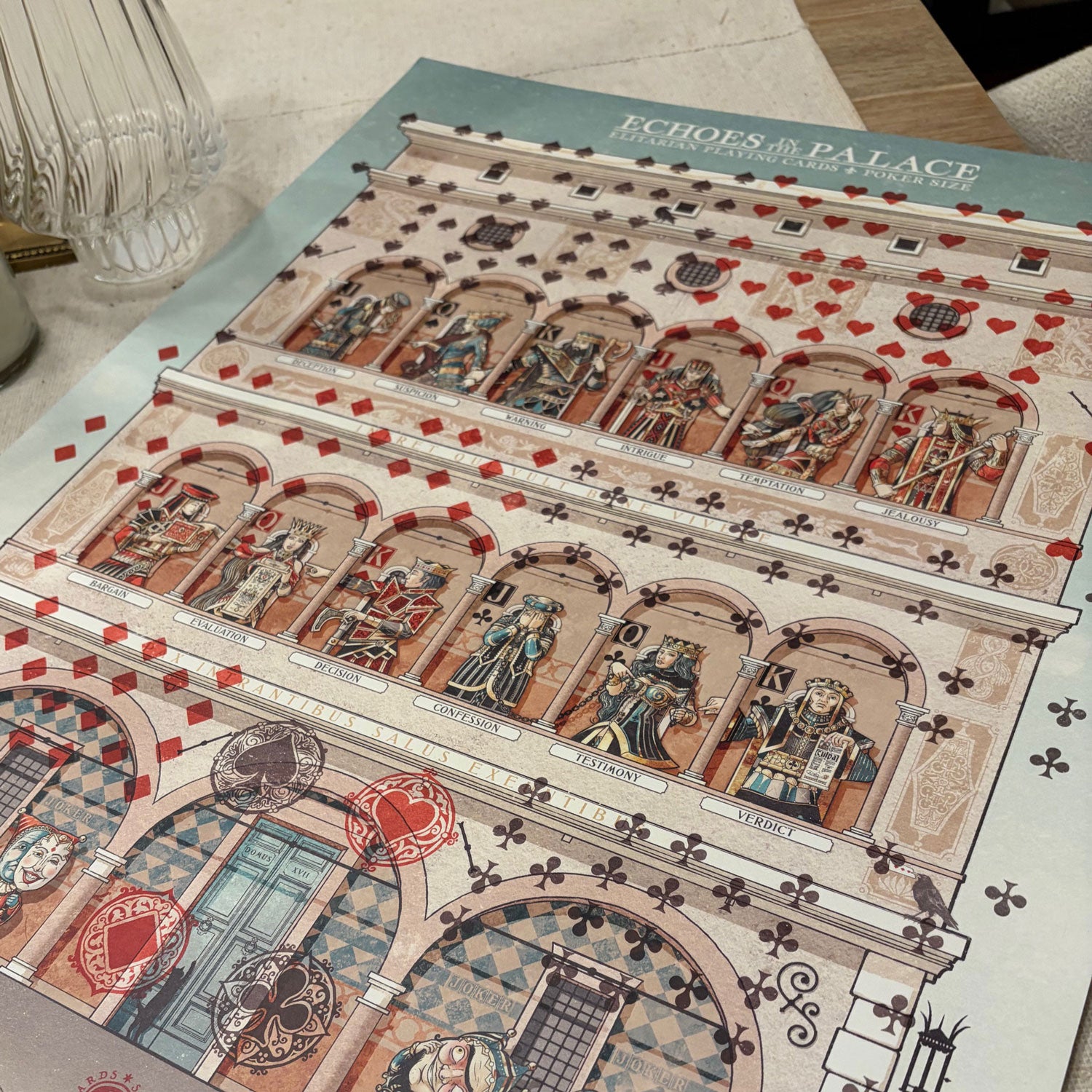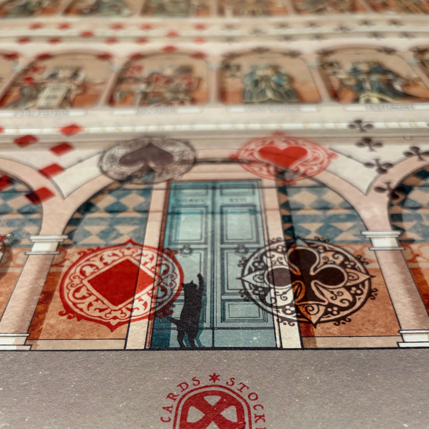 This 18x24" poster showcases the complete design of the deck — all 56 card faces united in a single composition. Unlike the poker size cards, this artwork reveals the entire palace and its scenery without visual breaks or separators. The white borders seen on the cards were a deliberate choice to highlight individual layouts, whereas this poster displays the uninterrupted full design.